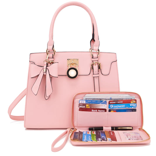 Qiyuer Women Purses And Handbags Set Ladies Top Handle Satchel Tote Shoulder Work Bag With Matching Clutch Wallet 2PCS Pink