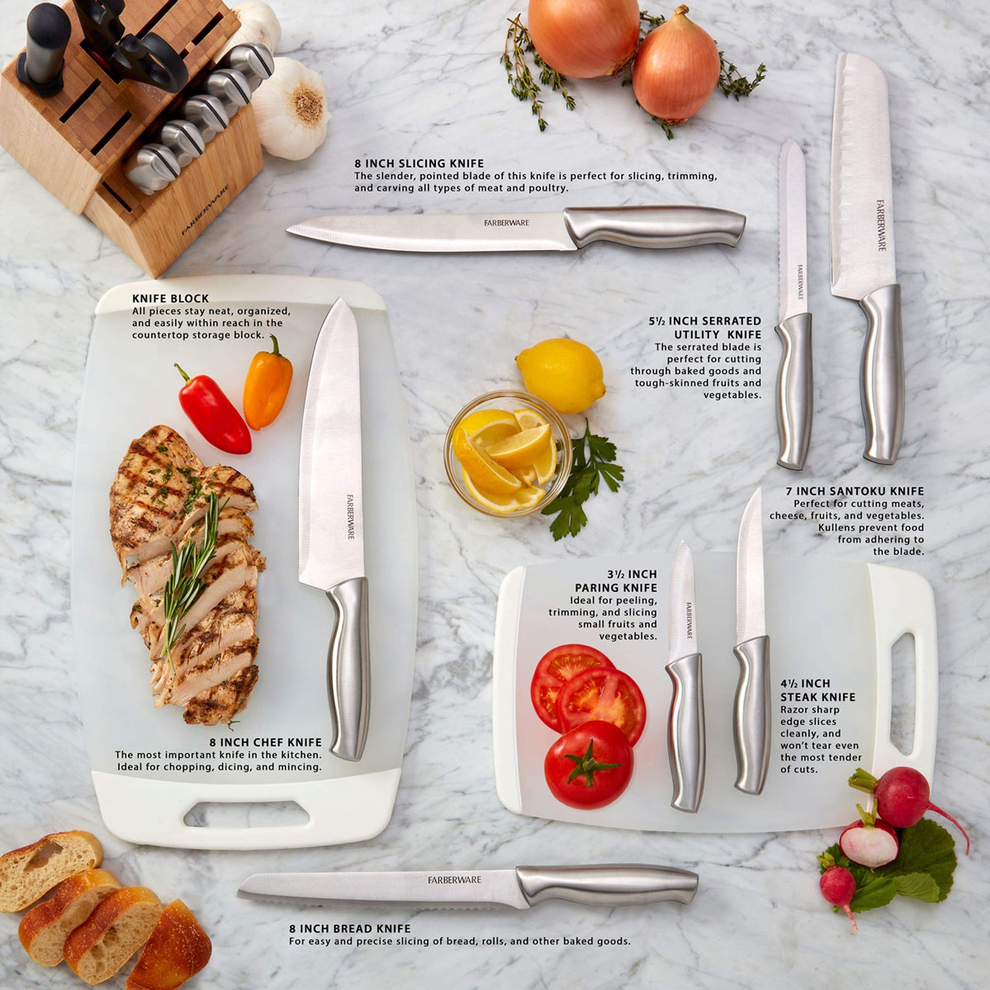 - 15 PIECE KNIFE BLOCK SET: This knife block set includes an 8 inch Chef Knife, 8 inch Bread Knife, 8 inch Slicing Knife, 7 inch Santoku Knife, 5.5 inch Serrated Utility Knife, 3.5 inch Paring Knife, (6) 4.5 Inch Steak Knives, an All Purpose Kitchen Shear, Sharpening Steel, and Bamboo Block
